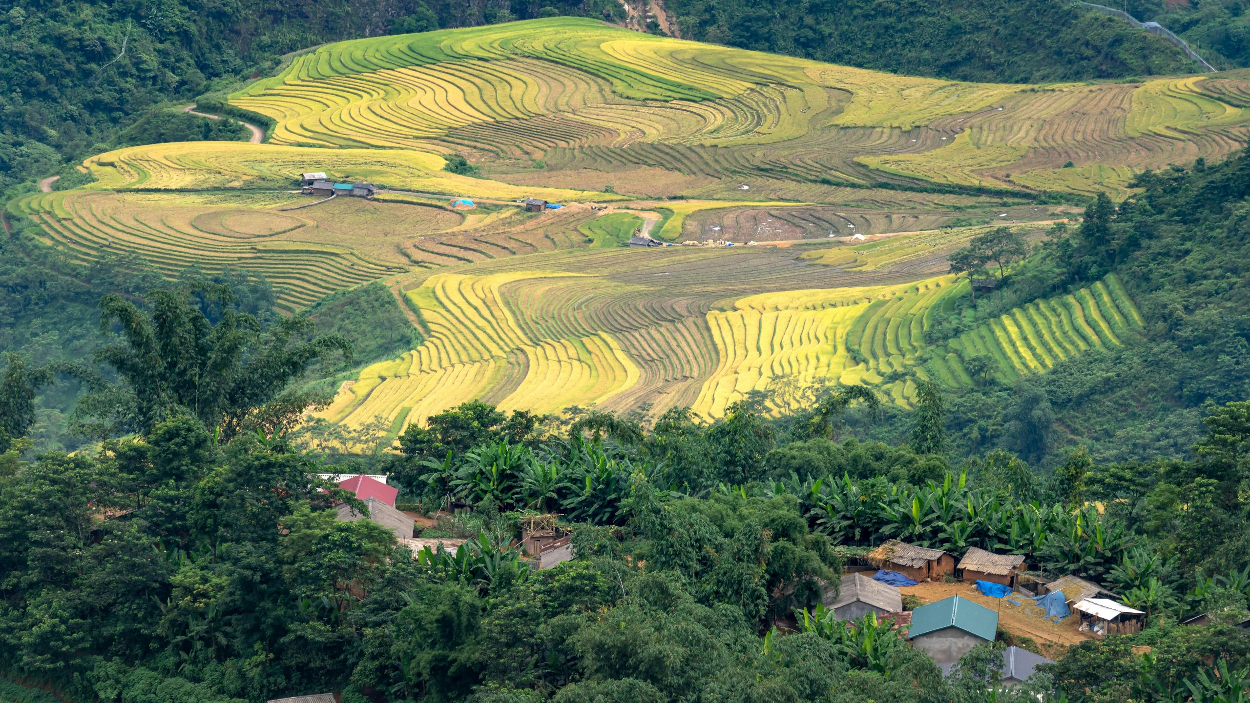 Vibrant rice terraces in scenic countryside with green hills and small houses.